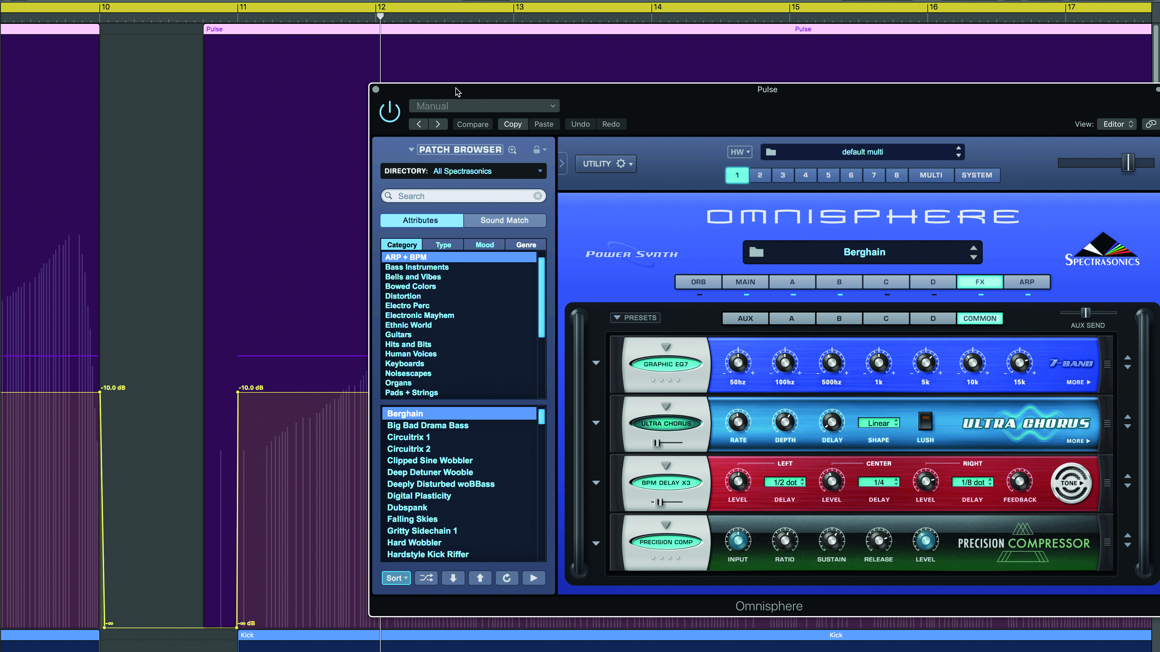 Step 2: We address the Omnisphere bass pulse first. The delays are coming from Omnisphere’s internal effects and we want to kill the delay returns and the natural release tail of the core sound too. An abrupt volume automation cut does both, with the ramp coming back up in time for the second phrase.