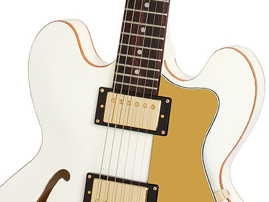 "The Dot Royale is Epiphone's salute to the ES-335 with gold Alnico Classic humbucker pickups, gold Epiphone pickguard, gold Grover machine heads, gold strap button, gold LockTone tune-o-matic bridge and LockTone stopbar tailpiece."