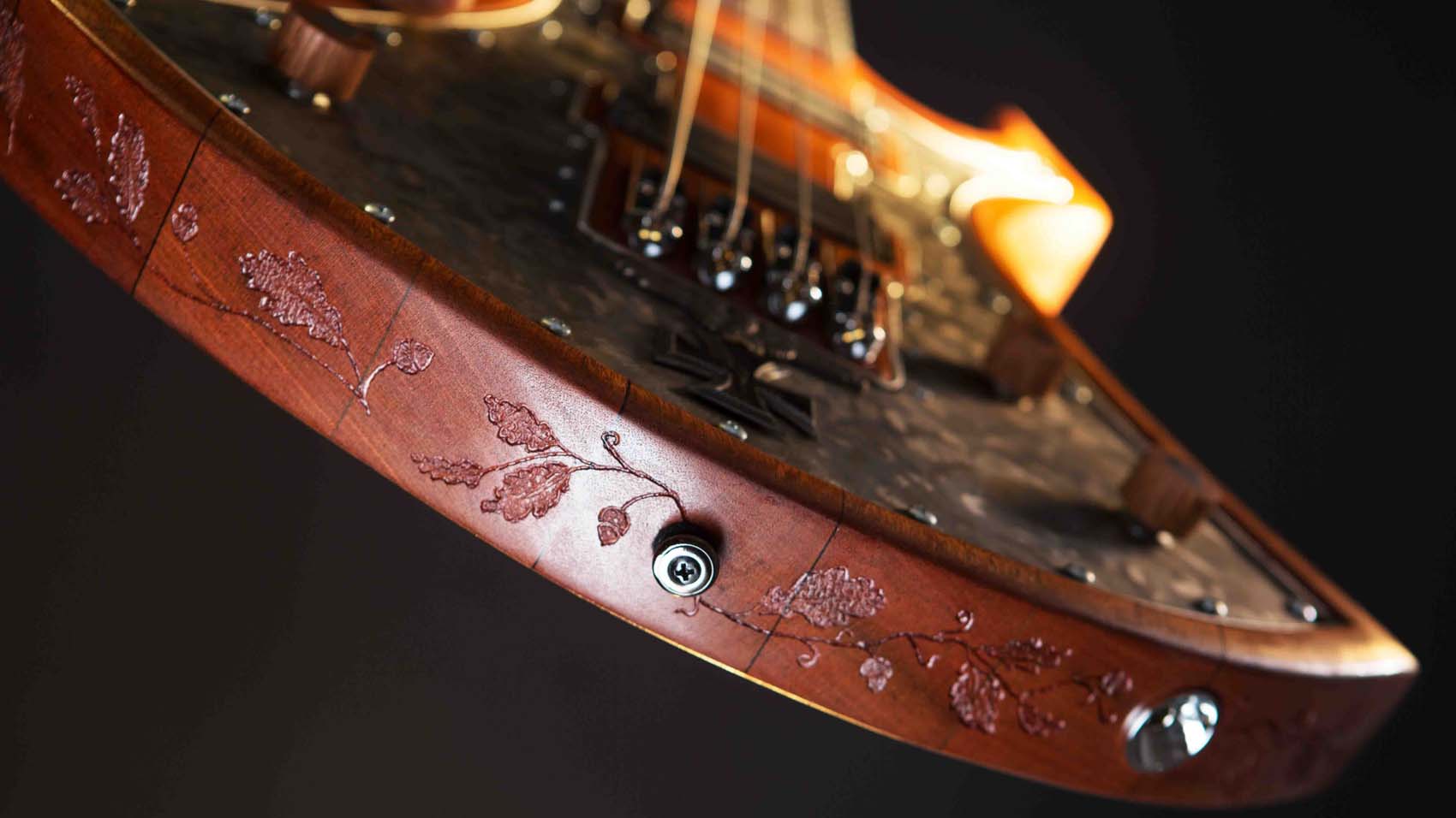 “The Lemmy Bass was designed around Motörhead’s iconic ‘Snaggletooth’ or ‘War-Pig’ emblem, complete with large curvaceous tusks, nightmarish teeth, nose ring and an insidious gaze. The idea was to manifest the entire character to purport a sensibility of power, eminence, unrest and sheer individuality.