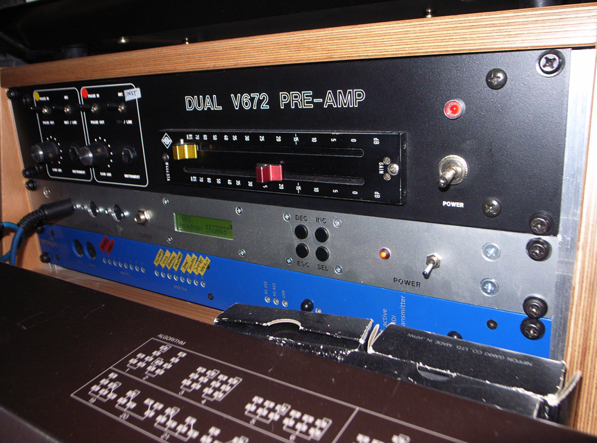 "This is a two-channel preamplifier made of two Telefunken V672 cards with a Neumann stereo fader. Sounds pretty clean up to a certain point, from there on you get a real nasty distortion. But sometimes this is just the ticket. Below you find a self-built MIDI to CV converter which drives all my mono-synths.
