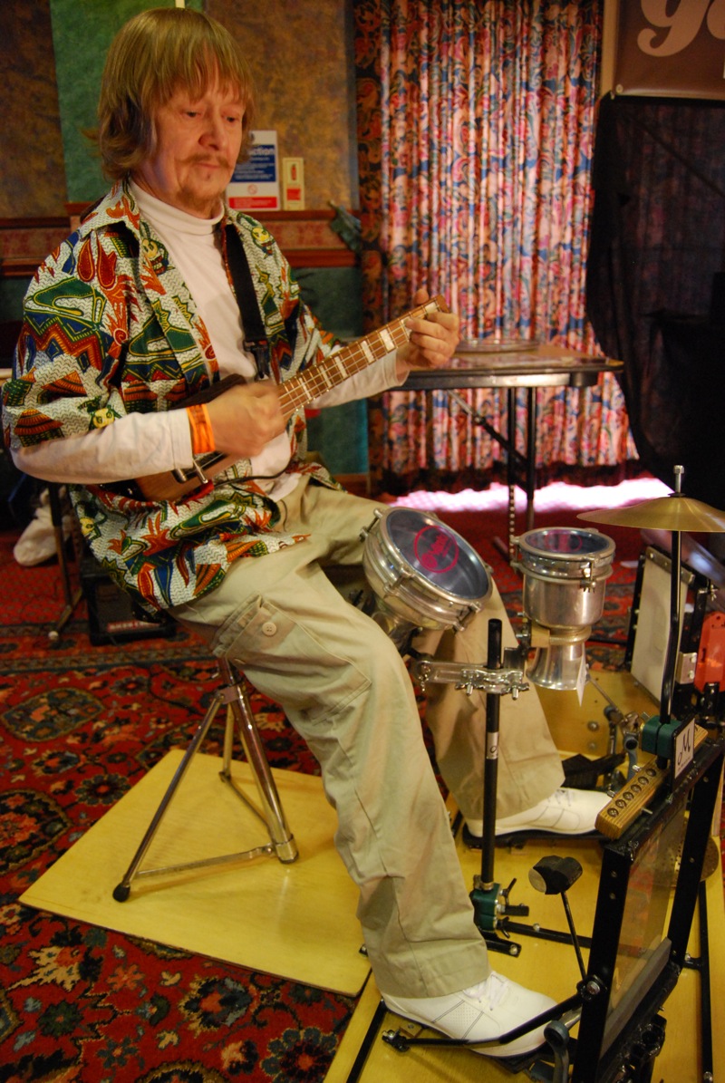 Another one of Marcus' inventions is this contraption that allows the player to keep a beat with the feet, whilst strumming, tooting or parping on any instrument that requires two hands.