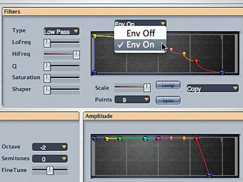Step 5: Let’s leave the filter Type as it is. Set the LoFreq slider to 285Hz, and the HiFreq to 8700Hz. The Resonance should be reasonably high, since there is some res action in our target sound; 750 or so is good. Activate the filter envelope and reduce the Point count to 5. Next, zoom out and create another envelope shape with slow fades, peaks and valleys.