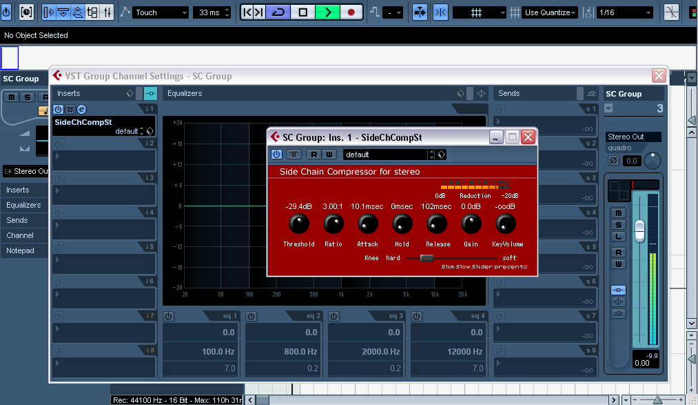 3. Once the new Quadro Group channel has been created, insert SC Compressor (download here) into it. In Cubase 4, this technique can be used to create multiband sidechain compression using Cubase´s Multiband Compressor plug-in.