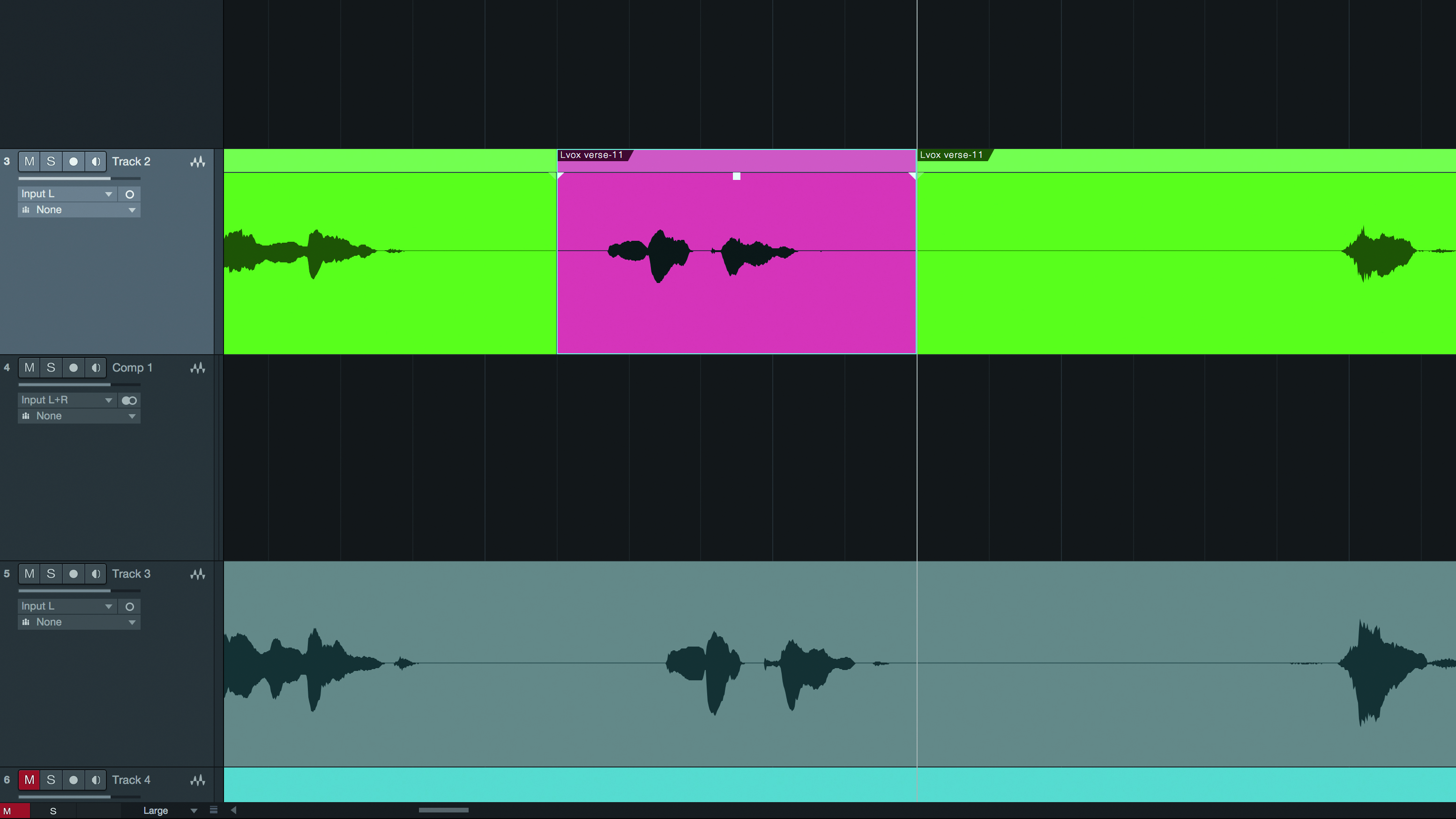 Step 2: With our audio files on the Layer lanes just below the main Track lane and the main Track empty, all we have to do to create the comp is use the mouse pointer to highlight the sections we want. These will then appear as regions in the main Track.