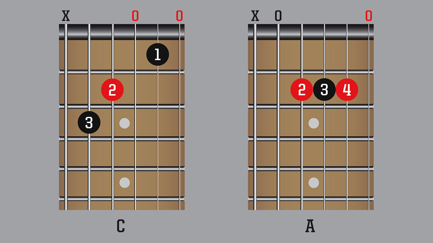 C, A, G, E and D are major chords with a bright, happy sound. Am, Em and Dm are minor chords (the lower case ‘m’ tells you this) and are darker and moodier. Black dots are root notes; red dots are other notes that make up the chords.