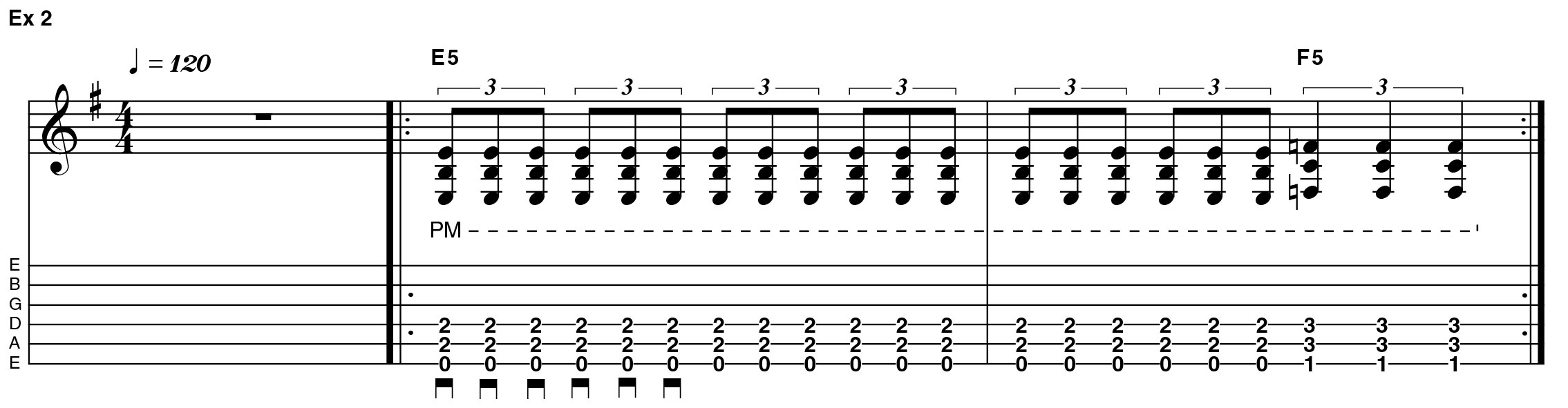 In Example 2 you can exercise that stamina for a much longer period. Here we have six beats of eighth-note triplet downstrokes, with a brief respite at the end, as the picking halves in speed to quarter-note triplets.