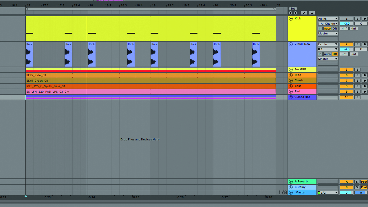 Step 4: Let’s recreate the splashy effect of the original hat in a more controlled way by layering another hi-hat component in. Add Hat Shimmer.wav onto a fresh channel, then shorten the region to one beat. Apply a sharp fade-out to the hat’s audio region, then duplicate it across every beat. Reducing volume to around -18dB blends it into the mix.