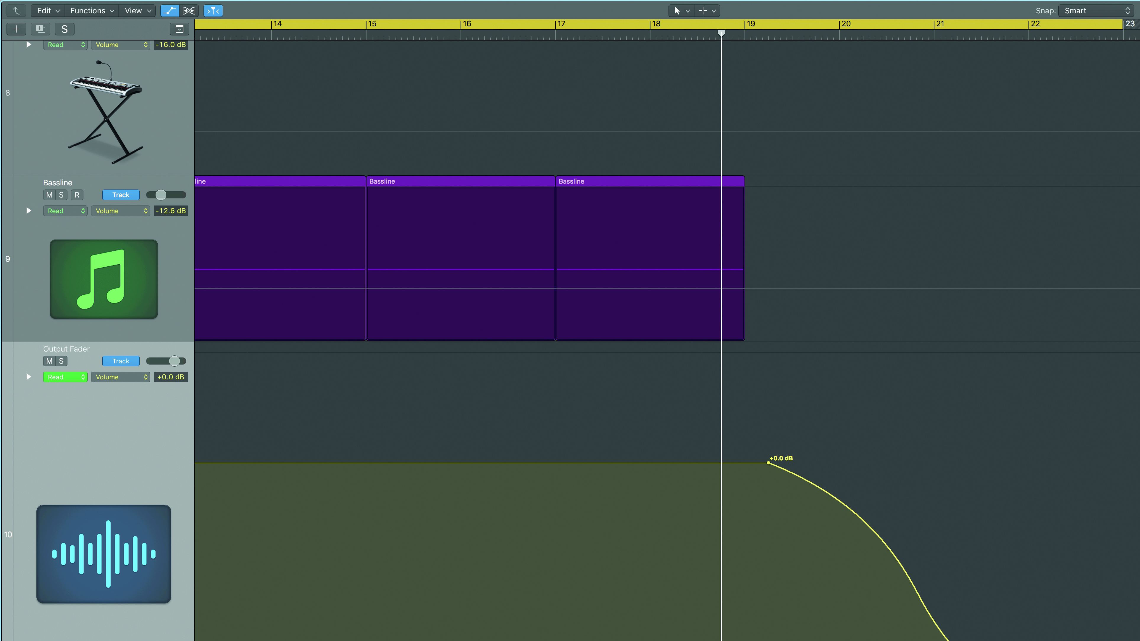 Step 6: Managing silence at the end of a track is important too. We have a number of sounds ending with long reverb tails. These could fade more musically than they do without intervention. Adding an automation line to the master output fader is a good idea, particularly contouring these with non-linear curves.