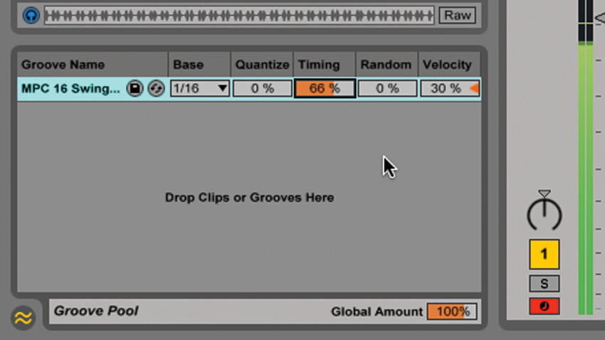 Step 5: It’s easier and more authentic to apply swing using your host DAW than to manually program it yourself, particularly if that system includes groove templates based on classic hip-hop beatboxes such as the Akai MPC. Live’s MPC-16 Swing 66 template, applied at 66% Timing, gets our beat sitting exactly where we want it.