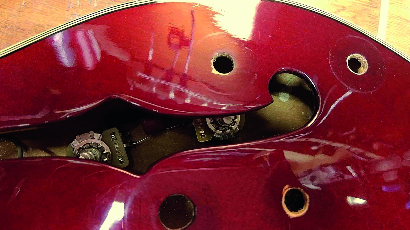 There are two unique features that need to be catered for to do a professional job on a hollowbody guitar. Firstly, the wiring needs to be screened so that no humming can enter the circuit. Secondly, no wires should cross the F-hole spoiling the look. Easy... right? To repair this circuit it’s often best to take out the whole kit and caboodle - without scratching the paint job, of course. So, with the help of some hair-brained techniques and pre-planning we’ll show you how to do this.