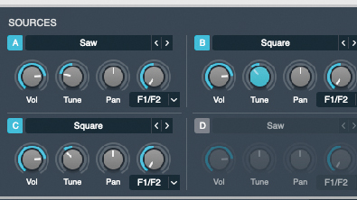 Our first oscillator is set as a saw wave and tuned down to -24 semitones (32’ tuning setting on the Minimoog). Next we engage Osc B. This will be a square wave oscillator, tuned to -12 semitones (16’ on the Moog).