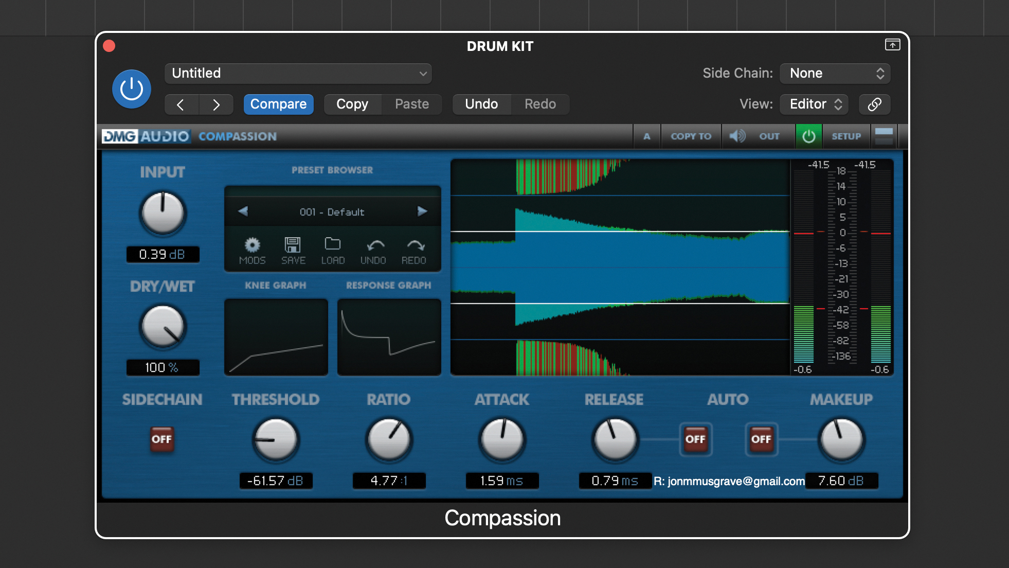 Drum kit kicks can benefit from a similar treatment. We’ve used the same compressor but adjusted the attack and release accordingly. Listening to the compressed sound with the mix set to 100% wet, we have a very over-compressed sound, but by blending this in (our mix is set to about 35%), we’ve created a more punchy sound.