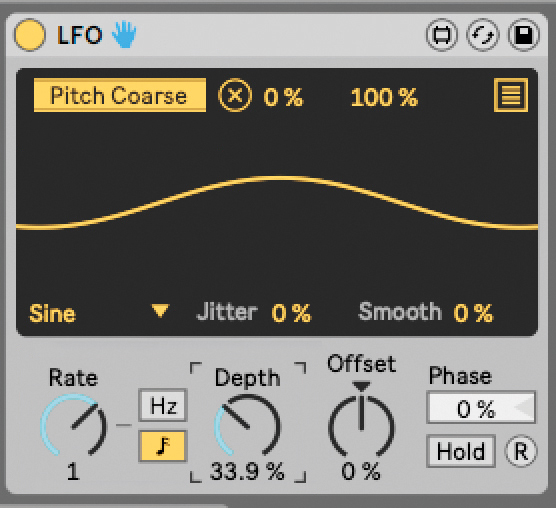 To apply LFO’s modulation to the Shifter, hit the Map button on the LFO device. Select the Coarse parameter on the Shifter device as the modulation destination. Now, to control LFO’s applied modulation you can set the Rate to Beat Sync and the desired value (for example 1 bar). We can also set the Depth to taste.