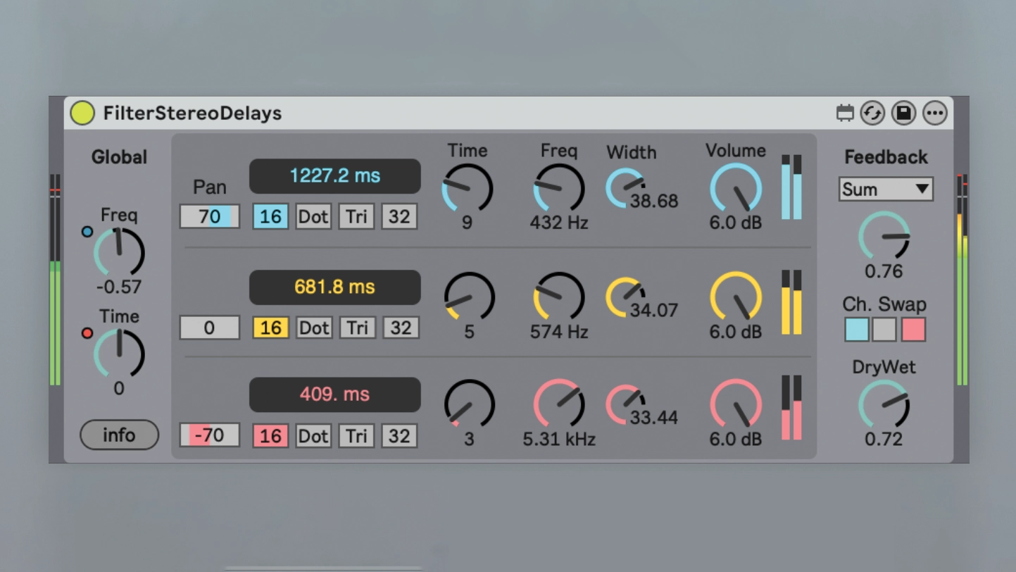 "The Ableton Filter Delay was one of the first devices I developed, partly inspired by the filtered delays in my Lexicon PCM 80. Back then, CPU limitations were a major concern, so the original effect only includes three mono delays and less flexible feedback routing."