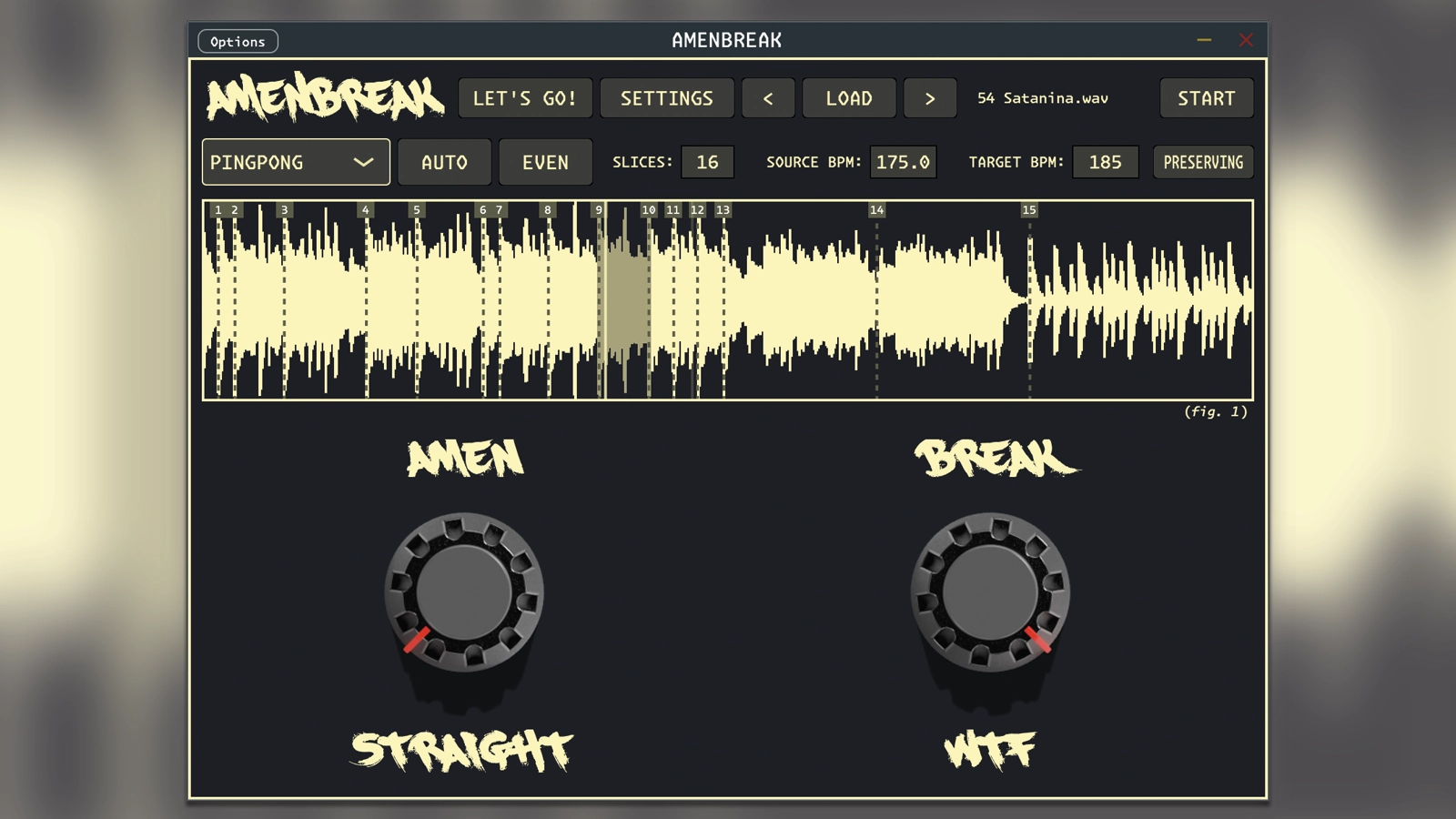 The plugin's equipped with two main modes that offer both both simplified and intuitive operation and deeper fine-grained control. The LETS GO! mode achieves the former via two central dials: an Amen knob that controls the slice rearrangement pattern, and a Break knob that controls the probability of random break effects. Simply chucking in a break and playing around with these two controls is enough to get you started.