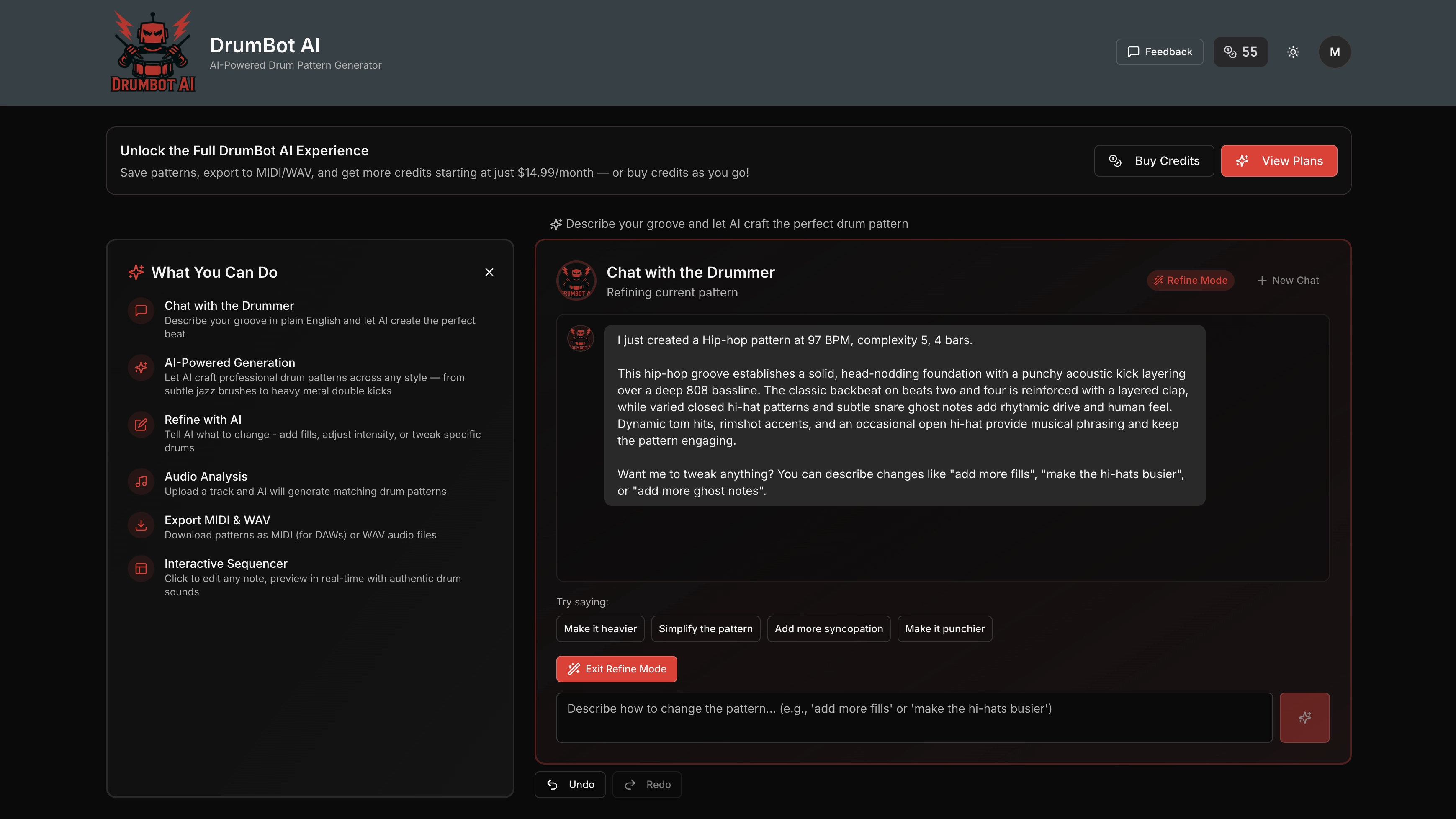 DrumBot AI is available now with a free Explorer tier (75 credits per month) alongside paid Creator ($14.99/month) and Pro ($29.99/month) plans.