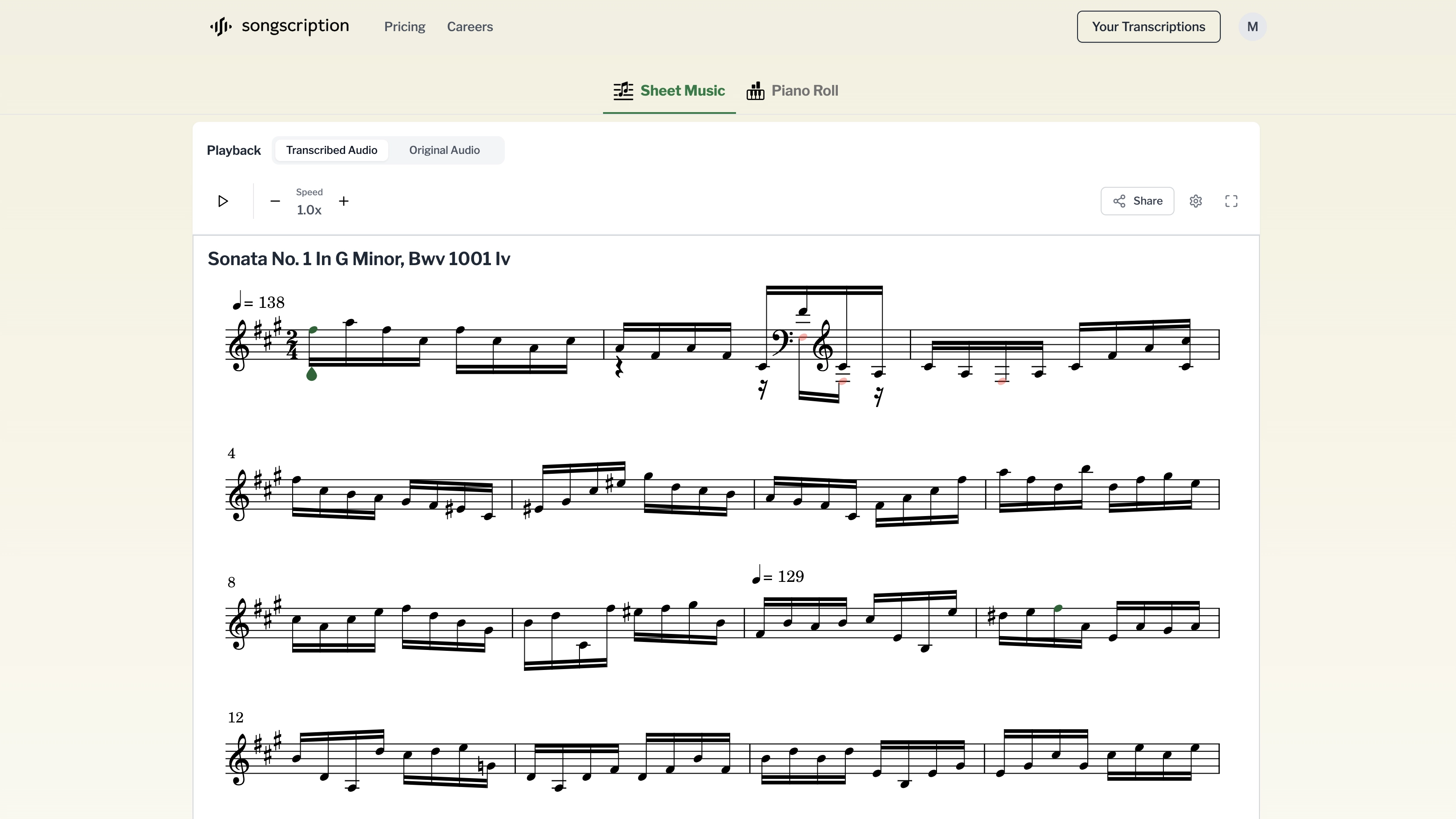 Given that Songscription clearly favors piano recordings, I decided to test some of those first. Click the links to compare Songscription’s output to the source audio.