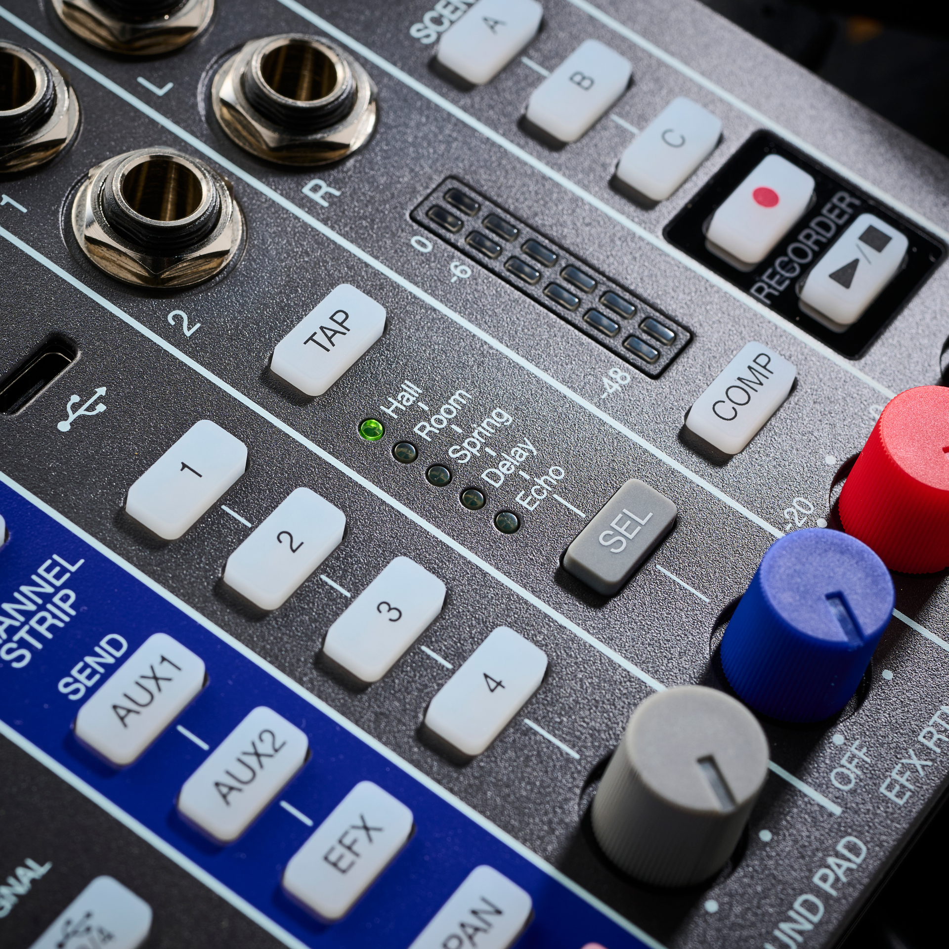 - DSP: channel EQ, master compressor, auxiliary effect (choice of 3 reverb and 2 delay).