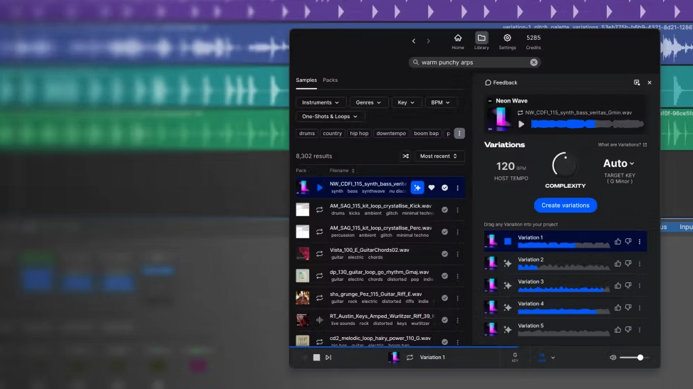 The new Variations tool can be used to create new versions of any Splice sample while preserving the identity of the original sound. Variations will create five uniquely different versions of a chosen sound, allowing you to specify a key and tempo for the output and dial in a specific level of complexity.