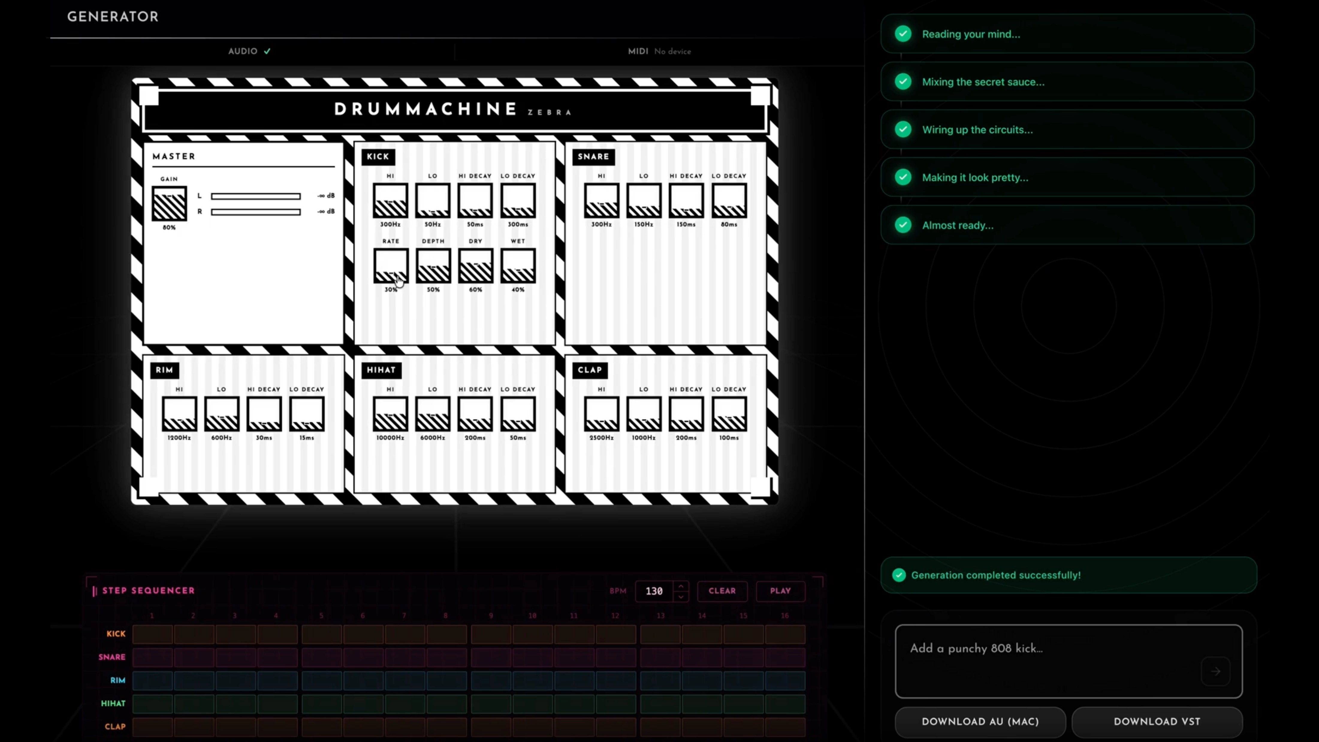 Described as “the first-ever browser-based AI-powered VST plugin generator,” Pluginmaker.ai creates your instrument or effect idea based on prompts typed into the browser. You can then test it via MIDI, on-screen keyboard or built-in sequencer right there, and adjust parameters and create new iterations until you’re satisfied with the results, after which you can download the completed plugin. Pluginmaker.ai provides a marketplace for you to sell (or give away) your creation, keeping 10% of any sales. You’re also allowed to sell it independently.