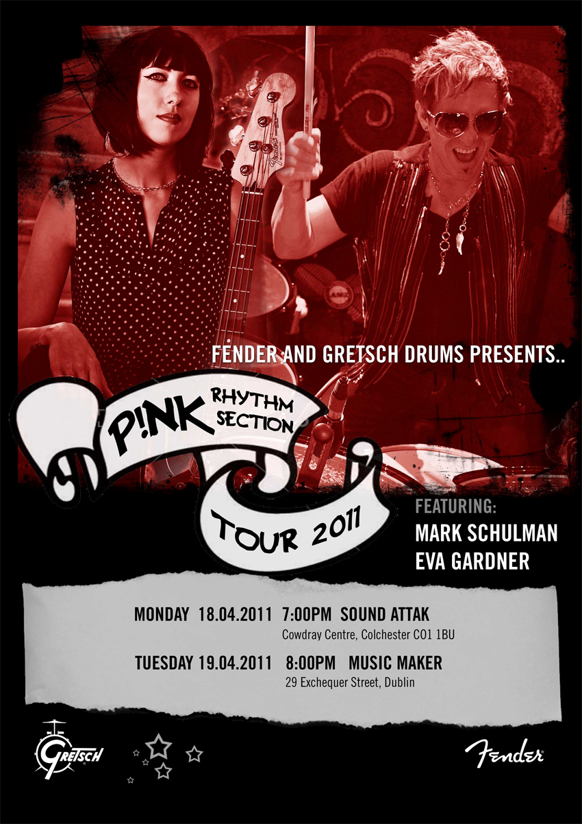 Fender and Gretsch Drums have announced a short clinic tour featuring Pink's rhythm section. Drummer Mark Schulman and bassist Eva Gardner will be appearing at Sound Attak in Colchester on 18 April, and Music Maker in Dublin on 19 April.