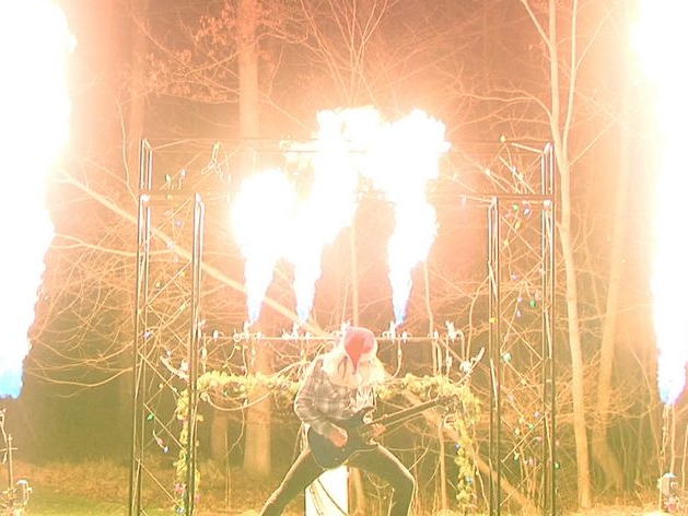 Now, this is cool. After experiments with Guitar Hero controllers, tech whiz Chris Marion utilised a Roland GK-3 pickup and GI-20 processor to send MIDI signals to custom software and computers, which trigger six separate flame cannons.