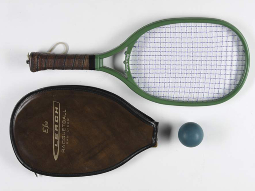 Elvis’s Steve Serot green plastic racket with brown leather grip is accompanied by the original brown faux leather cover. This has ’Leach of San Diego’ and ‘Elvis’ embossed in gold.
