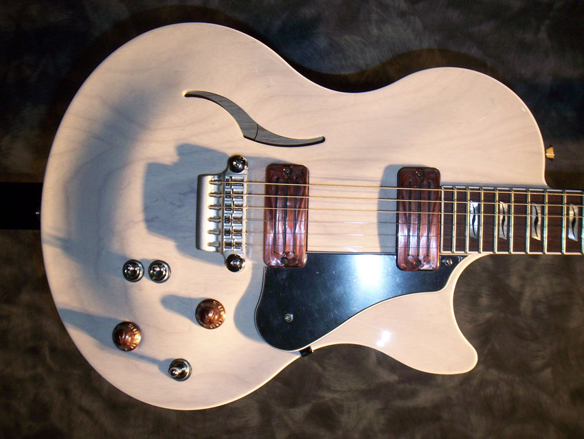 Two models are on offer: the ES-335-a-like Virage DC (short for Double Cutaway), and the Les Paul inspired Virage SC (Single Cutaway). Constructed from ash or mahogany (depending on the finish), the guitars are mostly hollow, except for two centre block strips onto which the pickups and bridge are mounted.