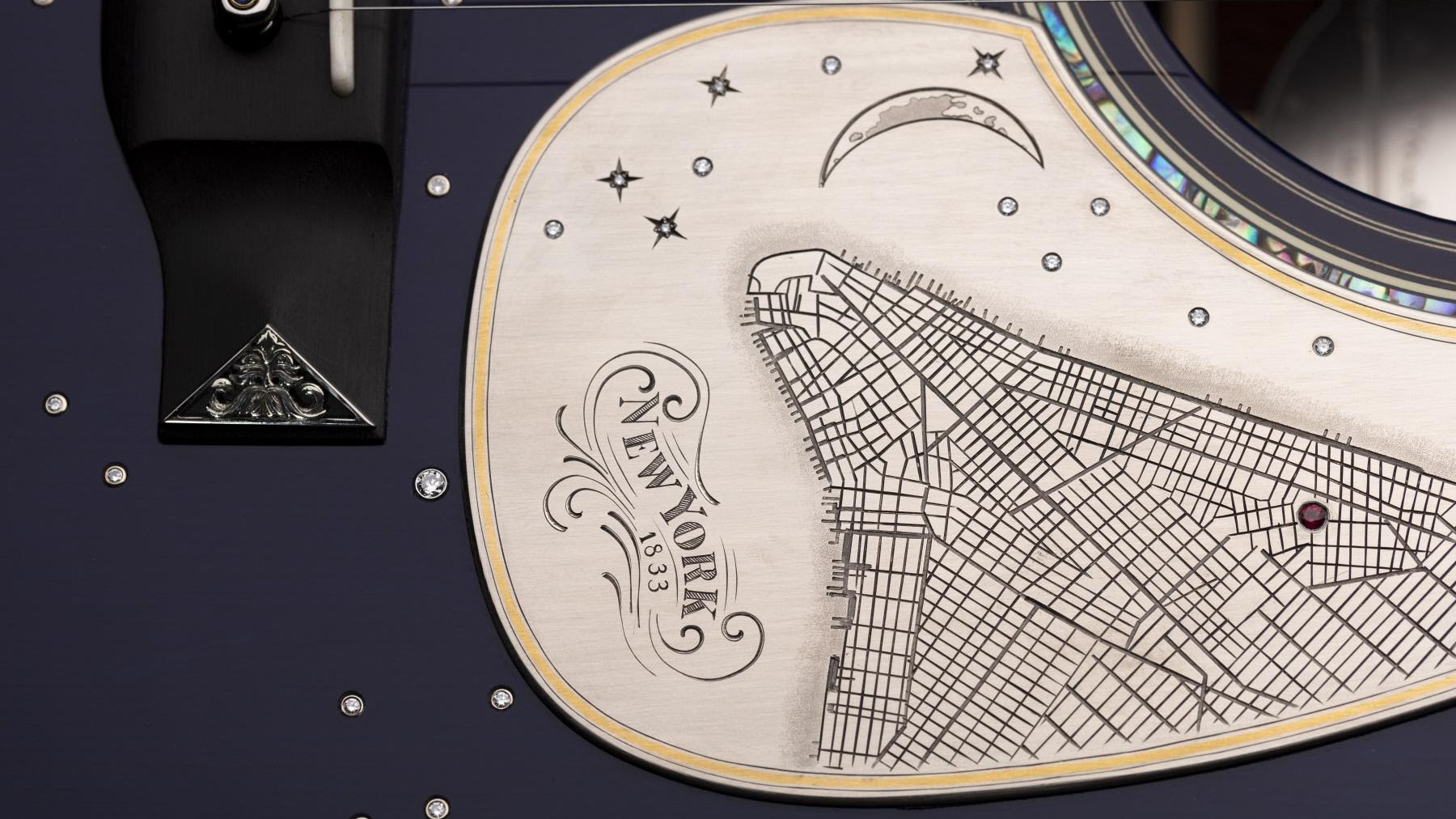 The guitar's hand-engraved pickguard features a map of lower Manhattan from 1833 with a ruby set at the location of C. F. Martin’s first store at 196 Hudson Street. On the inside of the guitar, the design features inlay work that includes a coat of arms for C. F. Sr.’s hometown in Germany, the sailing ship he arrived on, and the storefront of his first shop in New York City.