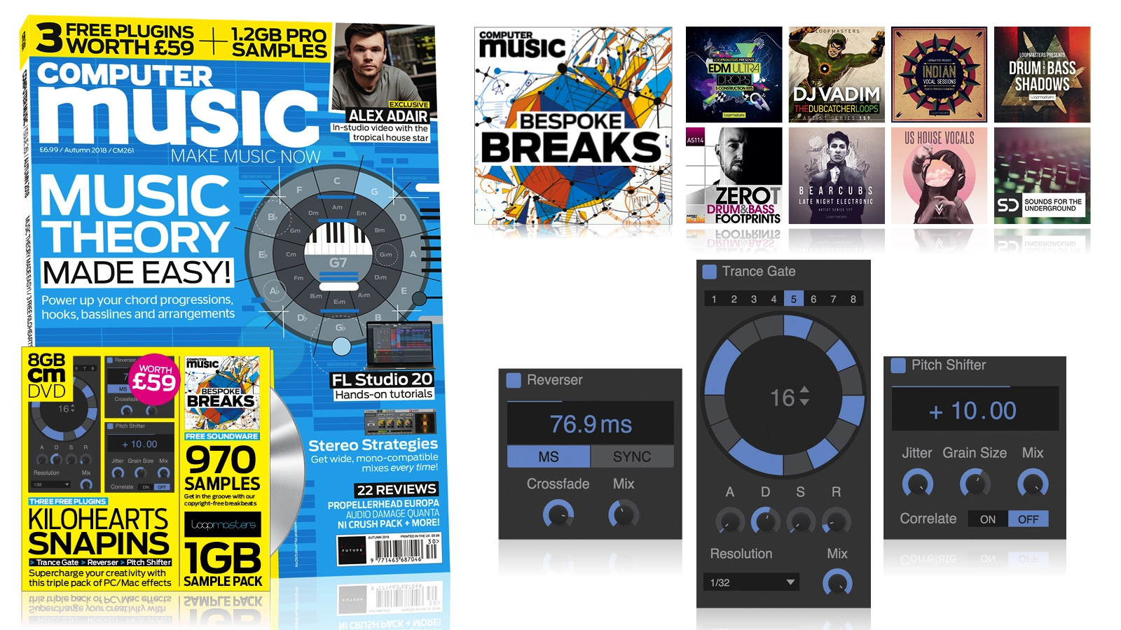 This month’s exclusive Computer Music software giveaway is a three-pack of superb effects plugins by Swedish developers Kilohearts, worth £59. Comprising Pitch Shifter, Reverser and Trance Gate, these tasty little audio processors not only sound great, but are also extremely easy to use, with just a handful of controls to get your head around for each one.