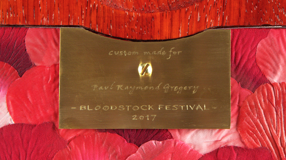 “Essentially, this guitar certainly has the most depth (in thought) of any instrument that I have ever created. The original idea stemmed from [Bloodstock founder] Paul Gregory about a year-and-a-half ago, though I only started working with the wood around six months ago…it had taken me over a year to completely fathom out all of the details and meticulous suggestive features!