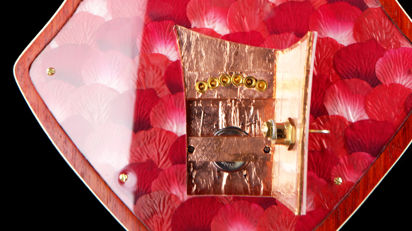 “The back of the guitar features a door that can only be opened with a golden key that serves as the truss rod cover. When opened, the door allows access into ‘Wonderland’, but also allows for the strings to be changed without removing the pressed-rose petalled backplate.