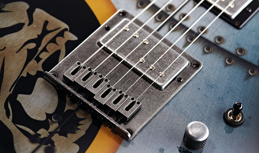 The pups, nestling under covers of the same distressed chrome finish as the six-saddle PT-H hardtail bridge, are wired to a master volume, master tone and a three-way pickup selector toggle switch. The master tone control also features a pull/ push switch to engage the coil- split function for both pickups.