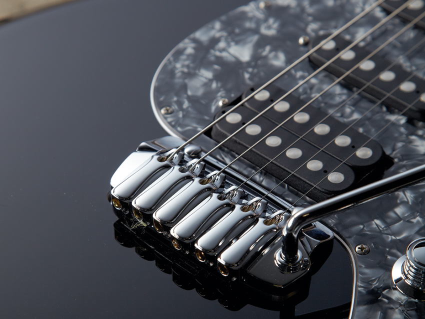This means the string is in contact with less of the nut material to reduce the chance of strings sticking and affecting accurate return to pitch. The aforementioned narrower bridge string spacing of 52mm is in line with most modern vibrato units.