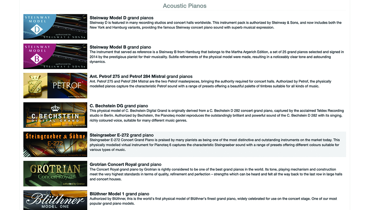 And we really should, of course, focus back on the piano and other packs, as this is where the real strength of the software has always been. With the acoustics, as shown in the top right picture, there is no stone left unturned now, with every major model here, and many endorsed by the companies that made the originals: Steinway, Bechstein, Petrof and more.