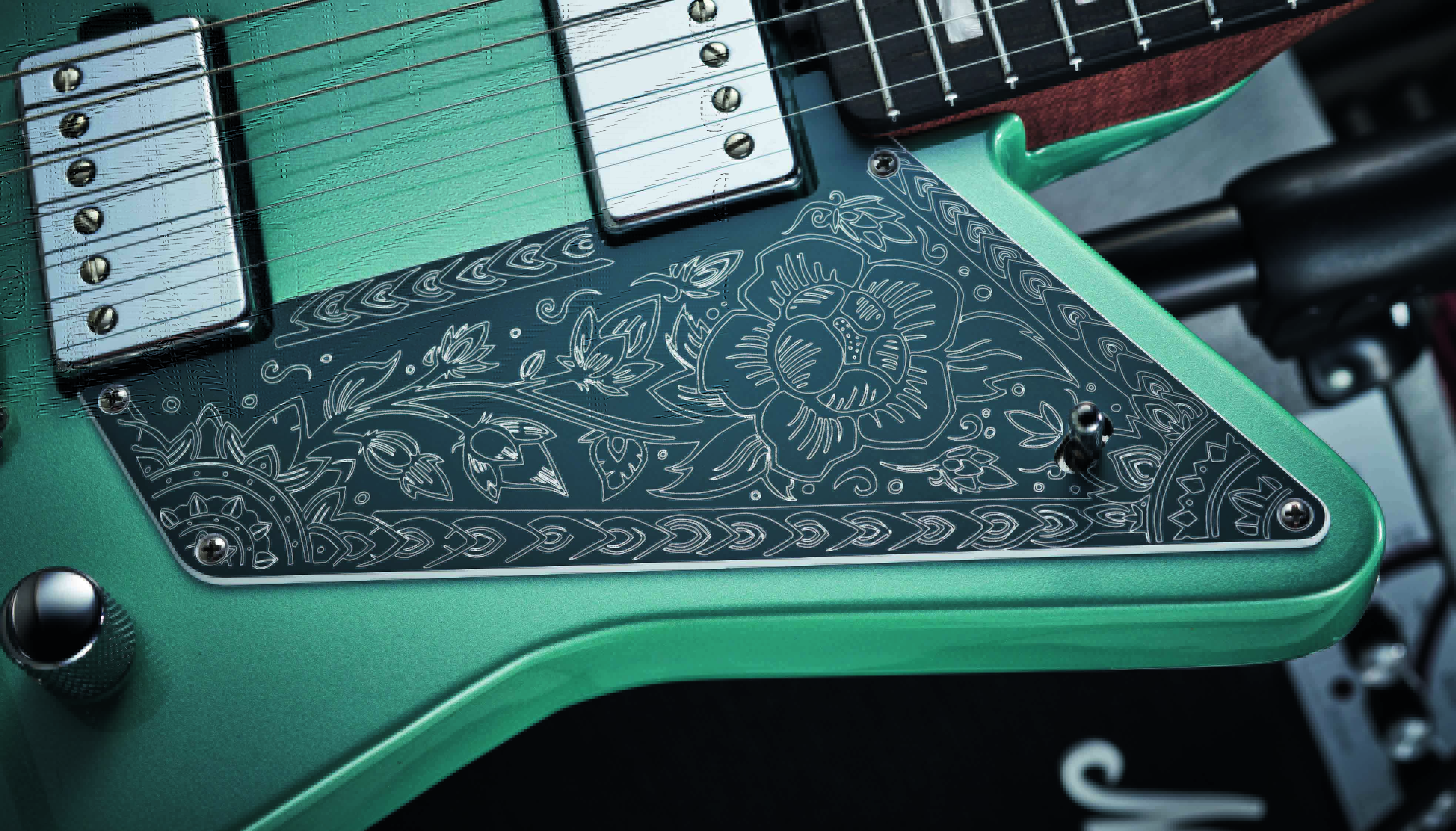 Its flat front has quite a small edge radius, while the back adds a ribcage contour and a larger edge radius. The heel is typically rounded and the tightly fitting neck screws on with five screws, rather than four. The Turbulent Green pickguard is lightly engraved with a flower motif and was designed in collaboration with Miami artist Peter Santa-Maria.