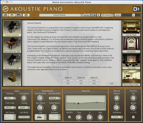 Akoustik Piano (what is it with that 'special K'?) contains four different models: a Bosendorfer 290 Imperial Grand; a Bechstein D 280 Grand; a Steingraeber und Soehne Vintage Upright 130; and the Concert Grand D (this last piano features samples from the Steinway Model D).