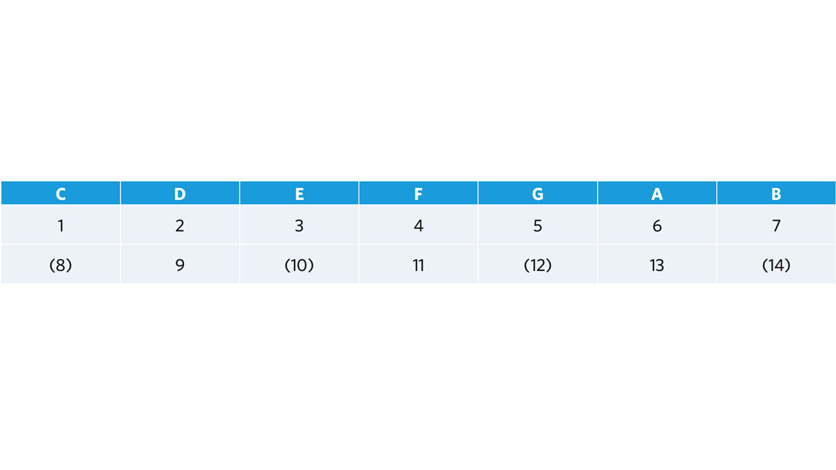 Chords that use lots of notes reference major scale notes an octave higher. These ‘octave up’ intervals are known as compound intervals. These are the notes, and numbered intervals in the key of C major.