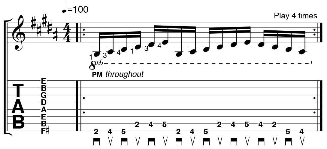 This tech-metal-style riff uses all eight strings on your guitar, and is based in the F# natural minor scale, roughly outlining 5th intervals as you cross the fretboard. Pick each note twice: first with a downstroke, then an upstroke. Make string changes cleaner by curling your pick out away from the plane of the strings with each upstroke; this should minimise the chance of hitting the wrong string when returning downwards.