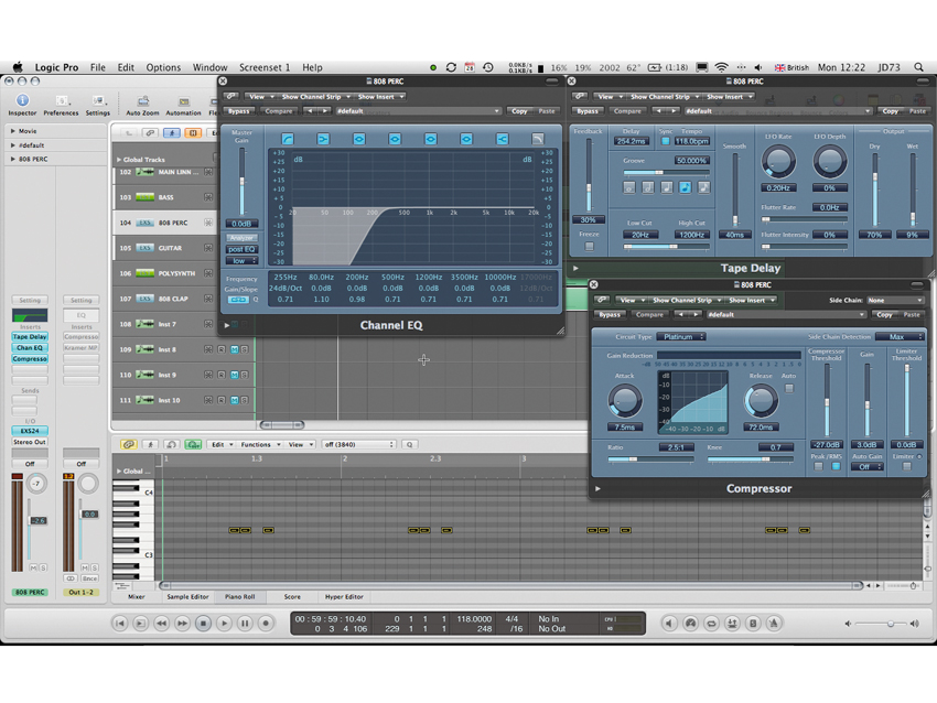 Play in the bassline (the note pitches and placement can be seen in the screen shot). Add some compression to even out the peaks and add punch and process the sound using the bass amp plug-in for that authentic tube DI sound. Finally, add a short plate reverb, using the predelay to make sure enough of the dry sound comes through, plus roll out all the bass below 67Hz with your EQ.