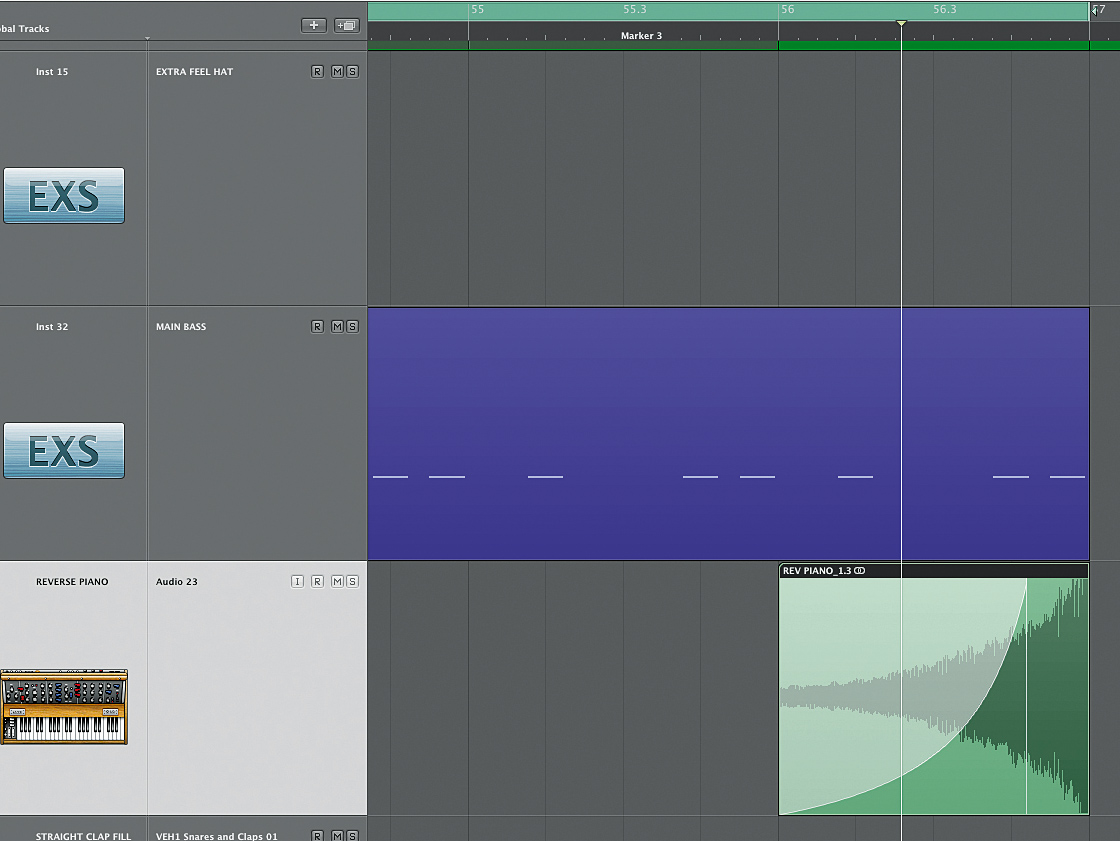 Step 6: Now we’ve created some space, what shall we do with it? Let’s go for a reverse piano. We’ve programmed this as a four-beat part, bounced it as audio and reversed it. Then it’s simply a case of setting a further fade-in amount, and we have a perfect segue with enough space for it to be heard.