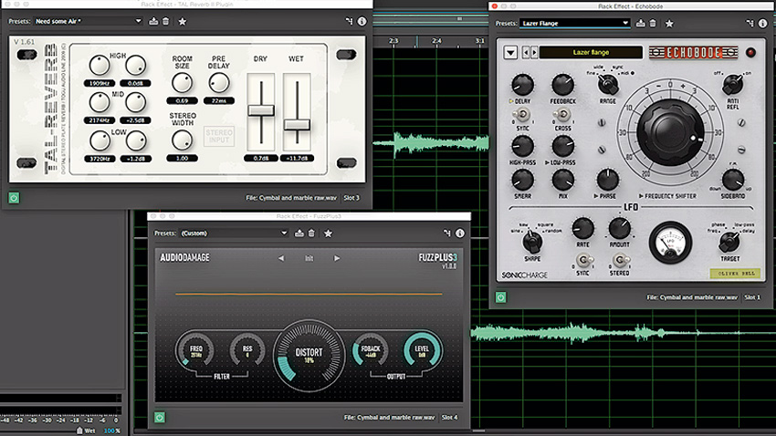 Step 3: Next, we take the raw sample again, reverse it, run it through a hall reverb and reverse it back again. Then we use Echobode, this time to add some flanging and raise the pitch, followed by some more reverb and a touch of distortion, for a sci-fi hum/lazer-style texture.