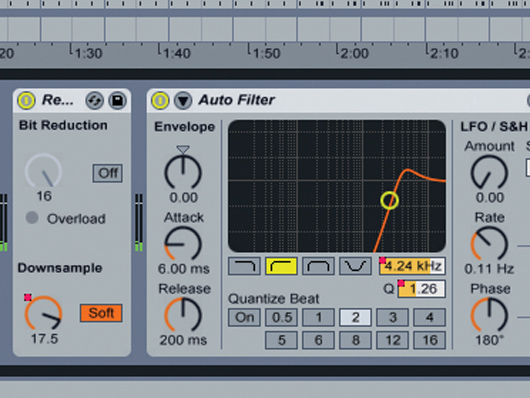 Step 6: It’s not just filters that can be automated during a transition: bit reduction or overdrive work equally well when combined with a filter. You can also use quite extreme settings throughout the quietest parts of the fade, which will often produce grainier textures and add more interest to very simple transitions.