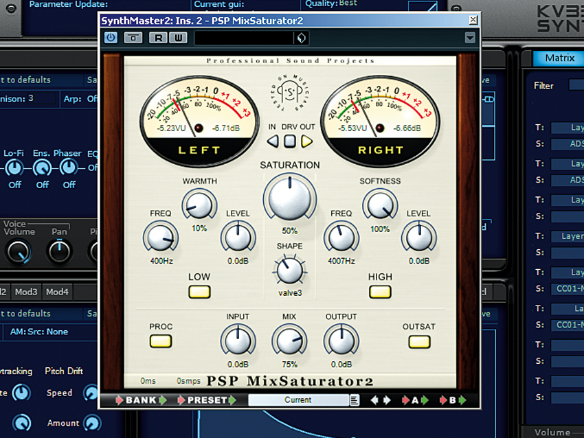 Step 9: PSP’s MixSaturator2 does a number of things to help beef up the tone. Activate Low with a Freq of around 400Hz and 10% Warmth to begin. Saturation at 50% with a Shape of Valve3 gives nice colouration. Activate High with a Freq of 4000Hz and 100% Softness to smooth out the top end. Activate Outsat to catch peaks, then reduce Mix to 75% to restore a bit of dry signal.
