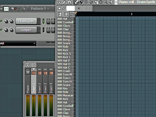Step 1: If you don’t own FL Studio 9, download and install the save-disabled demo (click here to download). Create a new project at a Tempo of 125bpm. Delete the sampler instruments in the step sequencer, and create a DrumSynth by right-clicking the instrument slot and selecting Insert»Fruity DrumSynth Live. Right-click the DrumSynth instrument slot and select Piano Roll to bring up the MIDI editor. By default, the keyboard interface shows the drum sounds on each of the keys.