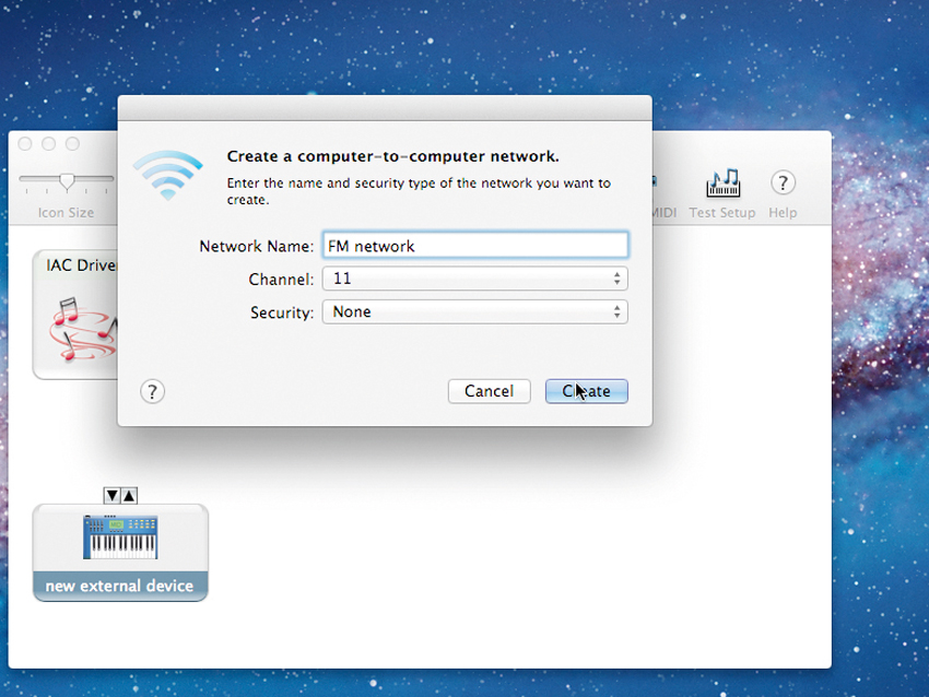 Open Audio MIDI Setup on computer A, double-click the Network icon, and create a Session in the My Sessions box. Choose ‘Anyone’ in the ‘Who may connect’ list.