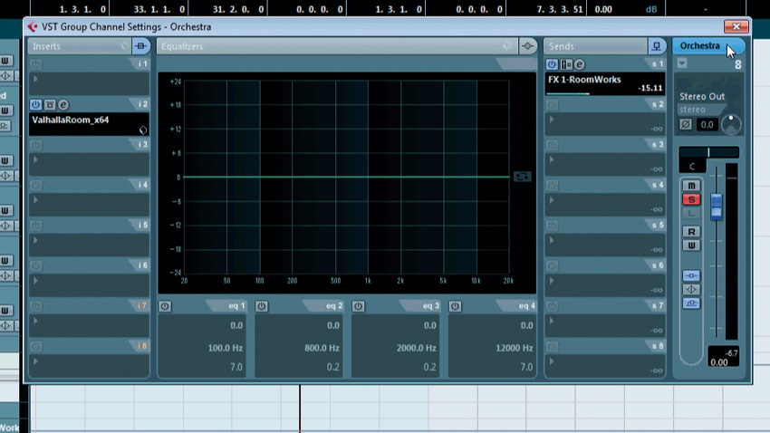 Step 7: Will turns up the send level of the string bus to the RoomWorks effect channel. As RoomWorks' Width is set to 0, its output is mono. With both the stereo ValhallaRoom and mono RoomWorks reverbs on them, the reverb will sound full even on larger systems where the stereo image is often compromised, or even totally mono.